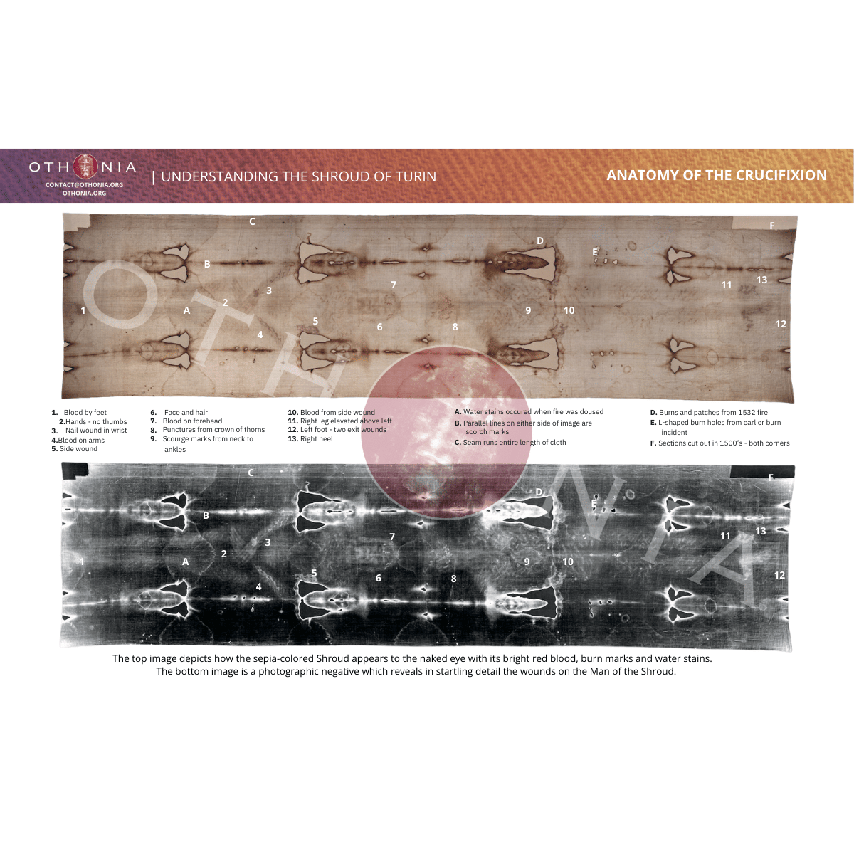 - Color and b/w images of the Shroud of Turin inside with legend
